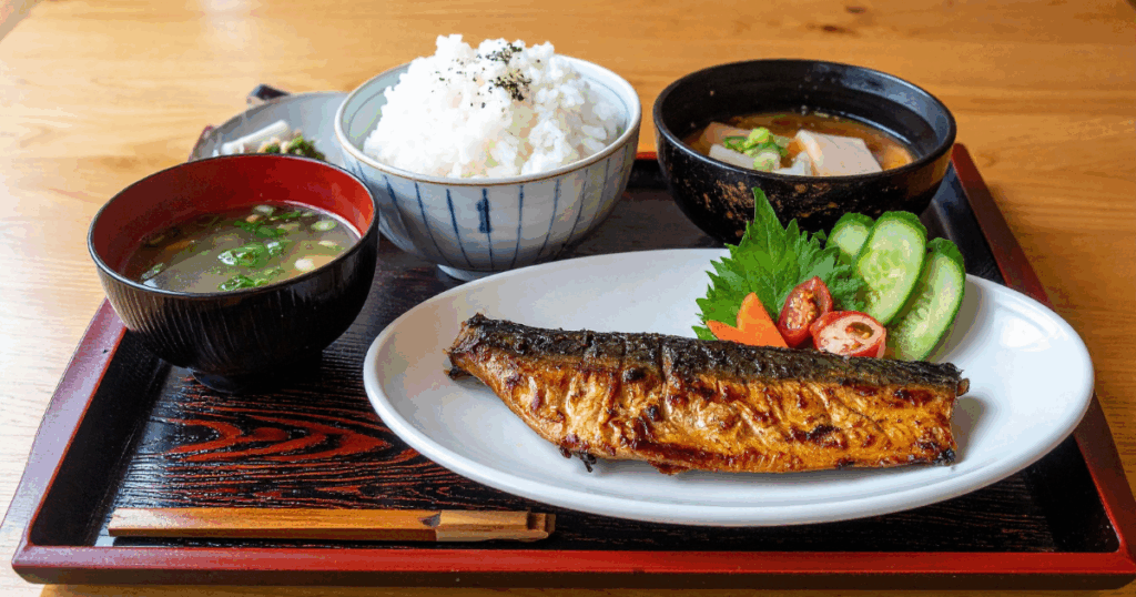 ご飯+鮭+味噌汁+野菜 | 適度 | 適度 | 適度 | エネルギー安定→代謝が落ちにくい |